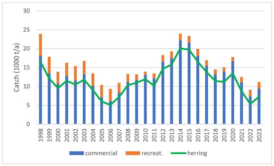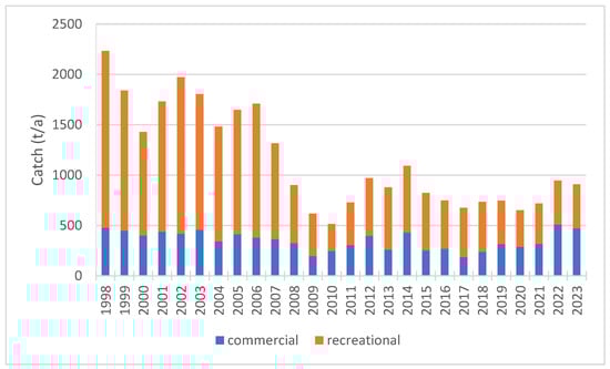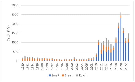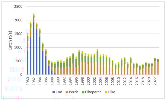 The catch data for various fish species in commercial fishing, starting from the year 1980, has been obtained from the official statistics produced by the Natural Resources Institute Finland (LUKE) []. Recreational fishing catch data has been available starting from 1998 and has been collected every other year []. The missing data for the intermediate years were estimated as the average of the preceding and following years.