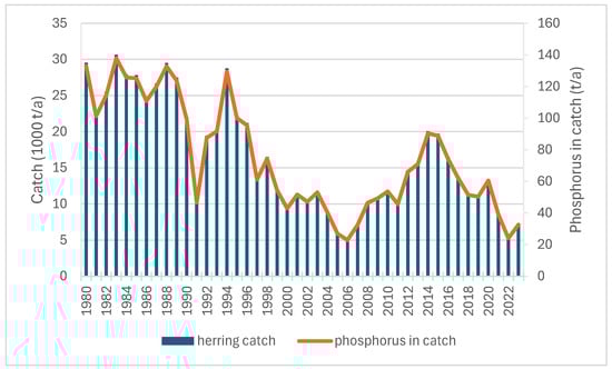 Over a longer period (1980–2023), the annual herring catch averaged 16,607 tons (SD 7689.9; median: 14,250.5 tons; minimum: 5105 tons; maximum: 30,651 tons; Figure 3). The amount of phosphorus contained in the annual Baltic herring catch during this period averaged 74.7 tons (SD: 34.6; median: 64.1 tons; range: 23.0–137.9 tons; Figure 2).