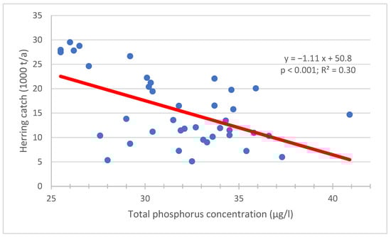 The wintertime (1 Jan–31 Mar) average total phosphorus concentration of the entire water column (0–50 m) at the Seili station vs. commercial Baltic herring catch in the Archipelago Sea in 1984–2023. The red line indicates the relationship between total phosphorus concentration (µg/L) and Baltic herring catch (t/year) (p < 0.001, R2 = 0.3).