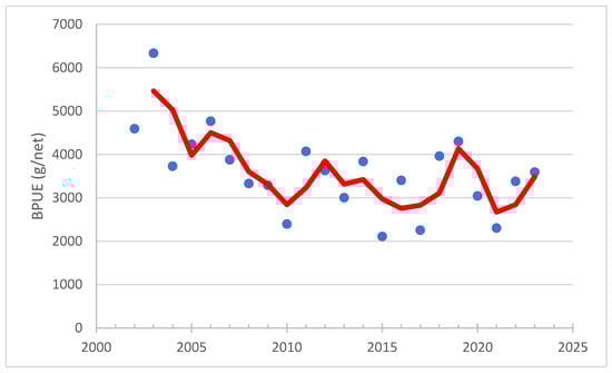 Perch catch (BPUE, g/net) of test fishing in the Archipelago Sea during the period 2000–2023. The red line indicates the moving average in the BPUE over the entire period under review.
