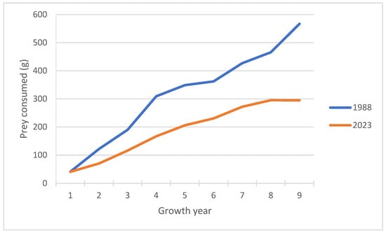 The growth of different herring age groups in 2023 was estimated based on the data of grid 29 in Table 4.2.3 of the ICES 2024 report [,] (Figure S1). The initial weight of YOY on June 1 was set at 1 g. The growth values for 1988 were derived from Table 4.2.6 [], which provided the average weights (g) of age groups for grids 25–32 (Figure S1) [].