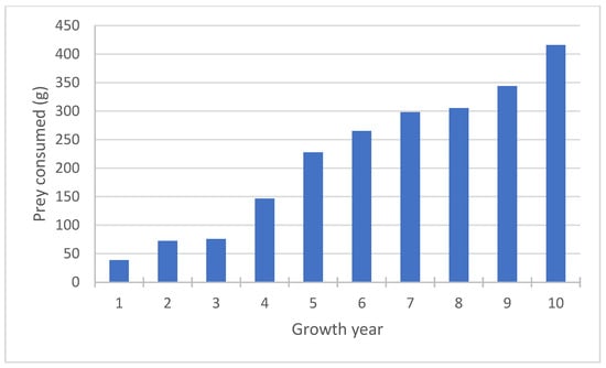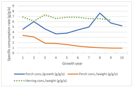 According to Jacobsen et al. [] in the Baltic Sea perch undergo two ontogenetic diet shifts, from zooplankton to macroinvertebrates at ca. 50 mm; and then to fish at ca. 250 mm. The proportion of fish in the diet increased with perch length from 2% in length class of 50–74 mm to 92% in the length class of 375–474 mm, and constituted ≥50% of the diet in perch in the size range of 250–474 mm. I used their research findings (Figure 2 in []) as input data for the model regarding the diet of perch, but I divided the food sources into only two groups—zooplankton, insects, and fish, etc. (Figure S5 []). According to Jacobsen et al. [], group 1 includes, among others, worms, caddisfly larvae, roes, amphipods, isopods, and mysids. For example, Chipps and Bennet [] have reported for juvenile Mysis relicta in Char Lake an energy value of 3.14 kJ g−1 wet wt. However, I used here for group 1 prey energy density value 3800 J/g (see earlier herring prey). For this group, the phosphorus content is also assumed to be 0.15%, based on the estimate previously applied in connection with herring prey.