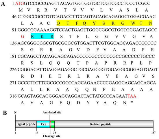 (A) Sequence of Sp-Crz and its encoded protein in the mud crab S. paramamosain. Mature peptide and proteolytic cleavage site are highlighted in yellow and blue, respectively. Start codon, stop codon, and amidation site are marked in red. (B) Structural diagram illustrating the domains of Sp-Crz.