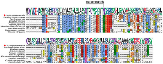 Multiple sequence alignment of Sp-Crz and its homologous proteins. P. trituberculatus (XP_045123222.1), C. maenas (AVA26882.1), Eriocheir sinensis (XP_050736175.1), Penaeus vannamei (XP_069978095.1), Penaeus japonicus (XP_042891384.1), Macrobrachium rosenbergii (ALA65535.1), Amyelois transitella (XP_060806943.1), Cyphomyrmex costatus (XP_018392400.1), Nasonia vitripennis (XP_001600665.1). Sp-Crz was highlighted by the red dot.