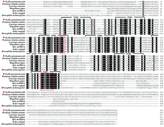 Sequence alignment of Sp-CrzR and the deorphanized receptors in arthropods. P. trituberculatus (OL694706.1), C. maenas (AVA26879.1), M. gigas (AKA95277.1), A. mellifera (NP_001137393.1), A. aegypti (AVI09462.1), D. melanogaster (AAM21341.1). Sp-CrzR was highlighted by the red dot. The conserved residues are shown with black shading, and conserved changes are indicated with gray shading. The transmembrane domains are marked with black boxes. The DRF motif and NSxxNPxxY motif are highlighted with red boxes.
