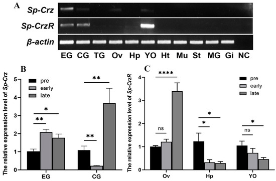 Expression patterns of Sp-Crz and its receptor in female mud crab S. paramamosain. (A) Expression pattern of Sp-Crz and Sp-CrzR in different tissues of S. paramamosain. EG: eyestalk ganglion; CG: cerebral ganglion; TG: thoracic ganglion; Ov: ovary; Hp: hepatopancreas; YO: Y-organ; Ht: heart; Mu: muscle; St: stomach; MG: middle gut; Gi: gill; NC: the amplification of deionized water was set as the negative control. (B,C) Sp-Crz and Sp-CrzR expression profile during ovarian development of S. paramamosain. pre: pre-vitellogenic stage; early: early vitellogenic stage; late: late vitellogenic stage. Data represent mean ± SEM (n = 4). * p < 0.05, ** p < 0.01, **** p < 0.0001 indicate significant differences when compared to the pre-vitellogenic stage.