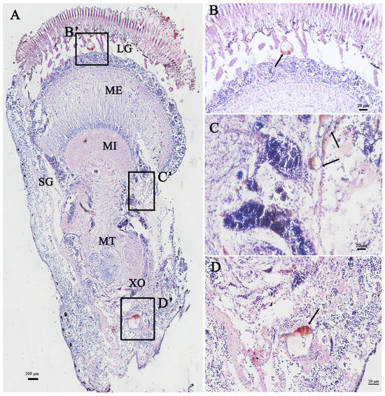 Localization of Crz in the eyestalk ganglion of S. paramamosain at the early vitellogenic stage. (A) Immunoreactive cells of Sp-Crz in the eyestalk ganglion. Scale bar: 200 µm. (B–D) Enlargement of the boxed regions (B’, C’ and D’) in A, showing Sp-Crz-expressing cell distribution in LG (B), MI (C) and the X-organ in MT (D). Scale bar: 20 µm. XO: X-organ; SG: sinus gland; LG: lamina ganglionaris; ME: medulla externa; MI: medulla interna; MT: medulla terminalis.