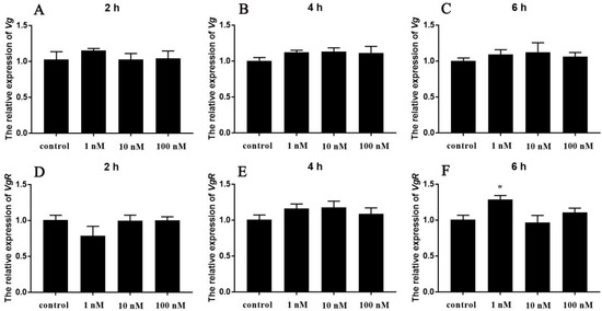 To explore the possible effect of Sp-Crz on vitellogenesis, synthetic peptide was applied to ovarian and hepatopancreatic explants at the early vitellogenic stage. This revealed that the level of Sp-Vg transcript in the hepatopancreas did not significantly change in response to 2, 4, and 6 h treatment of Sp-Crz at any concentration (Figure 7A–C). The level of Sp-VgR expression in the ovary was not affected by 2 and 4 h incubation of Sp-Crz at any concentration (Figure 7D,E); however, it was significantly increased by 6 h treatment of 1 nM Sp-Crz (p < 0.05, Figure 7F).