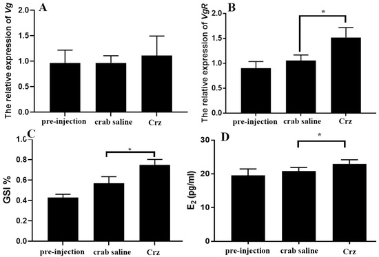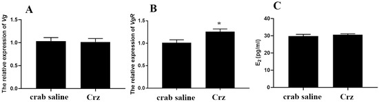 (A) The level of Vg transcript in the hepatopancreas after 12 h injection of Sp-Crz; (B) the level of VgR transcript in the ovary after 12 h injection of Sp-Crz; (C) E2 titer in hemolymph after 12 h injection of Sp-Crz. Data represent mean ± SEM (n = 7). Asterisk (* p < 0.05) indicates statistically significant differences when compared to crab saline control.