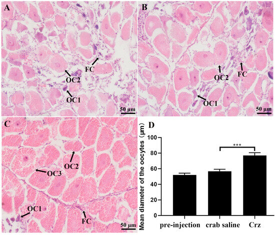 Histological changes in S. paramamosain ovary after long-term injection of Sp-Crz. (A) Pre-injection control; (B) blank control injected with crab saline; (C) experimental group injected with Sp-Crz. OC1: pre-vitellogenic oocyte; OC2: early vitellogenic oocyte; OC3: late vitellogenic oocyte; FC: follicular cell. Scale bars: 50 μm. (D) Mean diameter of oocytes. “***” indicates significant difference from the crab saline control (p < 0.001).