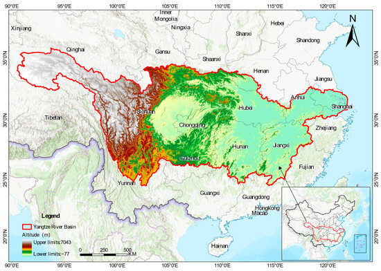 This study focused on the Yangtze River Basin, which is located in eastern China (90°34′ E to 122°11′ E, 26°03′ N to 35°33′ N) and spans Sichuan, Chongqing, Hubei, Hunan, Jiangxi, Anhui, Jiangsu, and Shanghai. This area covers 1.8 million km2 and houses over 400 million people. In addition, it features a diverse topography that ranges from 50 to 6000 m in elevation. The region is primarily influenced by temperate monsoon and subtropical humid climates.