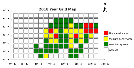 To quantify the spatial intensity of recreational fisheries, the Yangtze River Basin was partitioned into 154 standardized grids (each measuring 1.875° × 1.25° in latitude and longitude), and the number of recreational fishery POIs within each grid was systematically tallied. Based on POI density, grids were classified into four categories: non-recreational, low-density, medium-density, and high-density, corresponding to the intervals of [0, 1), [1, 10), [10, 50), and ≥50, respectively. As illustrated in Figure 2 (2018), red grids indicate high-density areas, yellow grids represent medium-density areas, green grids denote low-density areas, and white areas mark the absence of recreational fisheries.