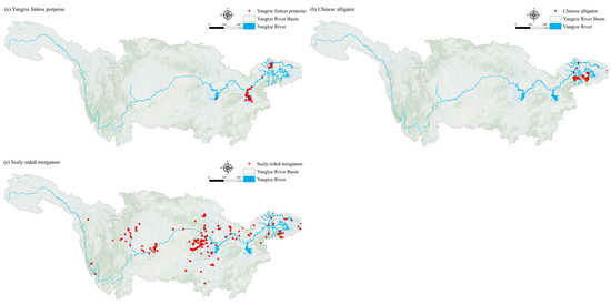 Sighting reports for the three flagship species were collected and verified. The corresponding geographic coordinates were also collected to delineate the Yangtze River Basin into unsuitable, low suitability, moderate suitability, and high suitability zones for these three species. These reports were sourced from the citizen science platforms iNaturalist (https://www.inaturalist.org/ accessed on 30 December 2024) and Birdreport (http://www.birdreport.cn/ accessed on 30 December 2024), as well as from former biological studies [46,47]. The locations of the sightings for the three flagship species are shown in Figure 3. The specific coordinates are provided in Supplementary Table S1.