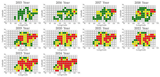 As shown in Table 1, the number of recreational fishery POIs in the Yangtze River Basin has exhibited a consistent upward trajectory, increasing from 340 in 2015 to 10,777 in 2024. This trend is further visualized in Figure 5. Grids (1.875° E × 1.25° N) were classified by POI density as non-recreational [0, 1), low [1, 10), medium [10, 50), and high ≥ 50; red, yellow, green, and white indicate these levels, respectively. In 2015, most grid cells contained no or very few POIs, as indicated by the dominance of white and green cells. Over time, more grids turned yellow and red, especially in the central and eastern regions of the basin. By 2024, a substantial portion of the grids had turned red, which highlighted the significant expansion of recreational fishery activities. This distribution was also influenced by abundant fishery cultural resources, diverse natural landscapes, and advancements in economic and social development [66,67].