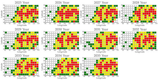 The prediction maps (Figure 6) show projected recreational fishery patterns (2025–2035) based on 1.875° E × 1.25° N grids, all in eastern longitude and northern latitude. Grids are classified by POI density as non-recreational [0, 1), low [1, 10), medium [10, 50), and high ≥50, shown in white, green, yellow, and red. The forecasts show steady expansion, especially toward the northern and southwestern regions. Medium-density areas are expected to grow most consistently, while high-density areas are projected to peak in 2024 and then gradually contract as many transition into medium density, indicating spatial redistribution rather than sharp decline. Although the total number of POIs is projected to decrease from 10,777 in 2024 to 7357 in 2035, medium- and low-density areas continue expanding, reflecting a shift toward broader but more moderate recreational activity. Compared to observed distributions from 2015 to 2024 (Figure 5), the projected patterns suggest both continuity and spatial restructuring. To clarify the locations of projected high-density areas, Appendix A Table A1 lists the counties and prefecture-level cities where the centers of high-density grids are located in 2024 and 2035.