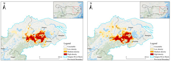 On the right side, the predicted overlap region (deep red) indicates a significant expansion, primarily in the water network region along the southern bank of the Yangtze River, west of Taihu Lake, and east of Chaohu Lake. This expansion covers administrative regions such as Ma’anshan, Wuhu, and Xuancheng, as well as wetland areas like the Yuxi River network, Shijiu Lake, and Gucheng Lake. The model predicts an increase in recreational fishing POI density in this region, which is expected to drive a transition from medium to high-density recreational fishing activities. This prediction is partially supported by the strategic plan of the Anhui Provincial Department of Agriculture and Rural Affairs, which designates these areas for development into Urban Recreational Fisheries Experience Zones.