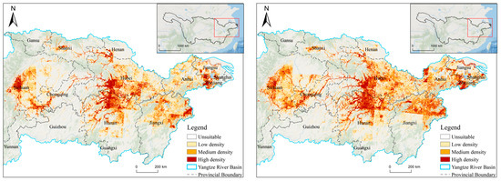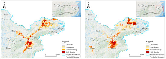 The suitable habitats for the Yangtze finless porpoise cover different seasonal ranges. During the dry season, porpoises mainly concentrate in the main channels of the middle and lower Yangtze River, especially in the sections of Anhui, Hubei, and Jiangsu. In the wet season, they are often active in Poyang Lake, Dongting Lake, their connected tributaries, and parts of the Gan River. Figure 8 illustrates the change in habitat suitability for the Yangtze finless porpoise, comparing the current distribution (left) to future projections (right). At present, high-suitability habitats are concentrated along the middle reaches of the Yangtze River, forming a relatively continuous ecological corridor that spans from the Three Gorges Reservoir area through central Hubei to the lower reaches in Jiangxi and Anhui Provinces. Key complementary habitats are also located around major connected water bodies such as Poyang Lake and the Yangtze estuary. In the future scenario, while core zones such as Poyang Lake and parts of central Hubei remain suitable, the overall spatial extent and connectivity of suitable habitats are projected to decline. High-suitability areas in western Hubei and eastern Anhui contract notably, and the previously continuous distribution becomes more fragmented. No new high-suitability regions emerge, suggesting increasing ecological degradation under anticipated environmental pressures.