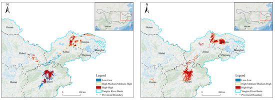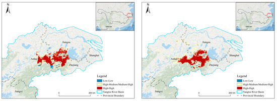 Figure 10 presents a comparison of the overlap regions (left: current, right: predicted). On the left side, the current overlap region (deep red) is primarily located at the junction of southern Anhui, southwestern Jiangsu, and northern Zhejiang. This region features diverse topography, including mountainous areas in southern Anhui, hills in southwestern Jiangsu, and plains in northern Zhejiang, with an extensive water system comprising wetlands, lakes, and rivers. This area is governed by a subtropical monsoon climate, characterized by mild temperatures, abundant precipitation, and infrequent extreme weather events. Notably, this region experiences fewer instances of extreme low temperatures in winter, making it a highly suitable habitat for the Yangtze alligator. In addition, the region benefits from a well-developed transportation network and sustains a diverse industrial structure, including agriculture, aquaculture, tourism, and ecological economies. This region constitutes a critical interface between the core habitat of the Chinese alligator and areas of intensive recreational fishery activities, posing challenges to balancing biodiversity conservation with economic development.