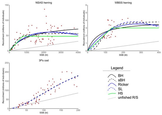 The five case study stocks evaluated in this study were four Atlantic herring stocks—Bothnian Sea (BS), Gulf of Riga (GoR), North Sea autumn spawners (NSAS), and Western Baltic spawning spawners (WBSS)—and one Atlantic cod stock: Northwest Atlantic Fisheries Organization (NAFO) subdivision 3Ps. The model-estimated SSB, recruitment, selectivity, and fixed model inputs of natural mortality rate (M)-at-age, weight-at-age, and maturity-at-age for the herring stocks were obtained from ICES stock assessment reports [,] and stock assessment outputs (stockassessment.org). The model-estimated SSB, recruitment, selectivity, and M-at-age and the fixed model inputs of weight-at-age and maturity-at-age for the 3Ps cod stock were obtained from [,,]. The NSAS and BS herring stocks used a stochastic state-space model [], the WBSS and GR herring stocks used a virtual population analysis approach using Extended Survivors Analysis [], and the 3Ps cod stock used an integrated state-space model []. Although the SSB and recruitment values for each stock are estimated, these models did not assume an underlying SRR. While there are potential issues with interpreting stock assessment estimates as independent observations for post hoc analyses [,], the intent of this study is to describe the effect of depensation on equilibrium reference point calculations, as inferred from recent stock assessments and reference point estimates are not intended for management purposes. The SRRs for the case studies have been previously published [,]. Inferences in the present study are conditional on the estimation models used for these stocks, and should be updated as new information becomes available.