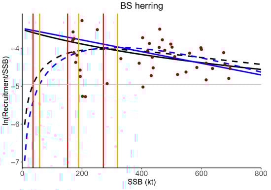 The change point in a hockey stick (HS) SRR was defined as BCP and is consistent with the ICES description of Blim for stock Type 2 (stocks with a wide dynamic range of SSB, and evidence that recruitment is or has been impaired) in ICES []. The change point was estimated following the methods of Barrowman and Myers [] using maximum-likelihood estimation assuming a lognormal error distribution. The HS model is as follows: