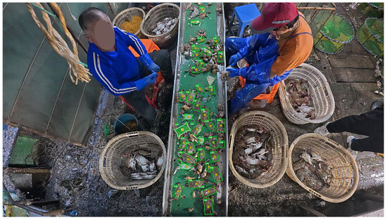 This study implements the swimming crab detection system during the pre-sorting phase of crab fishing operations, namely at the starting section of the sorting conveyor belt, as seen in Figure 10. The conveyor system utilizes a tiered sorting protocol: (1) Initial operators evaluate female Portunus trituberculatus for ecological release, (2) whereas following stations utilize tactile sensation to categorize Portunus trituberculatus specimens into three weight classifications: >150 g, 100–150 g, and <100 g.
