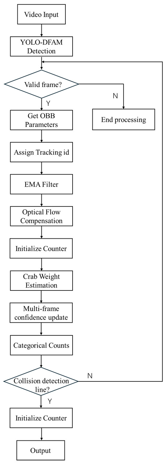 This study utilises an enhanced ByteTrack tracking algorithm to accurately count Portunus trituberculatus categorised by weight classes (large: >150 g, medium: 100–150 g, small: <100 g) through comprehensive kinematic modelling of their movement across conveyor belt collision detection lines. During detection, conventional approaches demonstrate variations in bounding box size and location instability due to repeated leg or claw movements following entry. To resolve these concerns, we implement an Exponentially Weighted Moving Average (EMA) filtering technique that combines current detection results with smoothed estimates from previous frames utilising predetermined smoothing parameters. This procedure consistently updates the coordinates of the target centroid, as well as its breadth and height, hence minimising detection noise and sudden fluctuations induced by local motion. Simultaneously, to alleviate significant angular variations of detection boxes during swift crab movement, we implement multi-frame smoothing methods for rotation angles. This entails the processing of angular data through rolling windows or Exponential Moving Average (EMA) techniques, averting abrupt fluctuations in detection box angles between 0° and 360° and ensuring steady and continuous bounding boxes. Within our system, oriented bounding box (OBB) data—comprising centroid coordinates, width, height, and angles—are retrieved and processed via the previously indicated methods for each frame prior to its application in subsequent data association and visualisation. This method markedly improves the resilience of tracking matches, hence minimising ID switches and trajectory fragmentation.