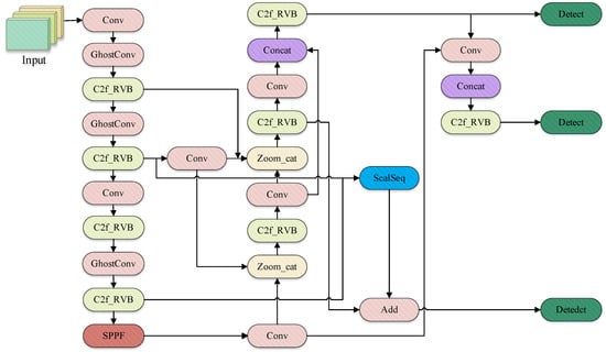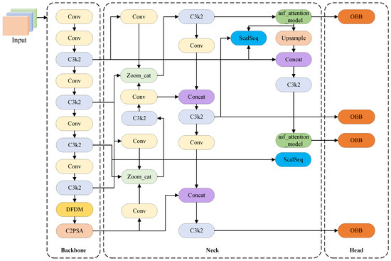 To balance detection accuracy and onboard computational efficiency, we adopt YOLOv11n as the base model. Compared with other lightweight models such as YOLOv8n, YOLOv11n offers better small-target localization and faster convergence while maintaining a lower computational load. Its modular design also facilitates the integration of attention mechanisms and multi-scale fusion, making it more adaptable to complex marine environments. However, in practical onboard scenarios, detection performance is often hindered by factors such as mutual occlusion, changes in lighting conditions, background clutter, and significant size variation of crabs. These challenges lead to missed detections, localization errors, and reduced robustness, especially when dealing with dense crab clusters or overlapping targets. Increasing model size to compensate would incur higher computational costs, which is unsuitable for deployment on fishing vessels with limited processing resources. To address these issues while preserving real-time performance, we introduce two key enhancements. First, the traditional pooling operation in the Focal Modulation module is replaced with a spatial–channel dual-attention gating mechanism to help the network focus more effectively on dense regions and suppress interference from irrelevant backgrounds like the sea surface. Second, the ASF-YOLO structure is integrated to strengthen the model’s ability to handle targets of varying sizes and alleviate occlusion by adaptively fusing multi-scale features. These enhancements are implemented with minimal increase in model complexity, forming YOLO-DFAM, a detection framework optimized for challenging marine environments. Figure 4 illustrates the enhanced model architecture.