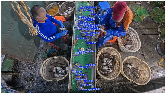 To accurately capture the real-world sorting scenarios of Portunus trituberculatus, a dataset was constructed based on video footage collected from crab trawlers operating in Daishan, Zhejiang Province—an important production area known for its representative fishing methods. Raw footage from multiple vessels was manually filtered to exclude low-quality or redundant segments. Approximately 10 min of footage per vessel were selected, and frames were extracted using PotPlayer software v.231113 (1.7.22038). A total of 419 high-quality images were obtained and manually annotated using the x-anylabelImg tool (X-AnyLabeling-CPU-2.3), where each crab was labeled with the class “crab.” Although the number of images is relatively small, each image contains over 45 crab instances on average, resulting in a total of 18,837 labeled targets. These targets exhibit significant diversity in appearance, scale, and occlusion, providing sufficient variability for training.