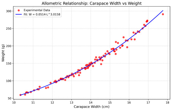 Samples were obtained via crab cage traps in the ocean at coordinates 31.06 N 123.18 W on 31 March 2025. One hundred individual male pike crabs, characterized by complete and fresh specimens, were selected from the screened samples. The whole nail width and wet weight of these samples were measured using vernier calipers and an electronic balance to recalibrate the localization parameters. This study employed an independent nail width–weight model developed using the nonlinear least squares approach, intricately linked to the unique ecological features of offshore Zhejiang. The b-value of male crabs in this sea, 3.016, exceeds the values of 2.899 in Bohai Bay [22] and 2.599 in the northern Yellow Sea [23], as determined by the analysis of measured data. Using a standard 15 cm nail width sample, the direct application of the Bohai Bay model results in a 12.7% underestimation of body weight (theoretical value of 189.5 g versus measured mean value of 217.3 g). This cross-sea parameter application error can induce kiloton discrepancies in population biomass estimation. Through iterative optimization, the final model parameters were established as: a = 0.0514 ± 0.0008 (95% confidence interval) and b = 3.0158 ± 0.0123 (95% confidence interval), with a coefficient of determination R2 = 0.9856. This outcome indicates a robust power–function correlation between nail width and body weight, demonstrating that the model effectively explains body weight fluctuation with considerable statistical significance. From a biological perspective, the parameter a functions as a conditioning factor, indicating the extent of nutritional reserves and fattening in individual pike crabs. The value obtained in this study, 0.0514, fell within the conventional range of historical research data for the East China Sea, yet it exhibited systematic discrepancies when compared to reported values in Bohai Bay and the northern Yellow Sea, potentially attributable to variations in ecological factors such as bait abundance and water temperature gradients across these marine regions. The parameter b representing the anisotropic growth index was approximately 3 (b = 3.016), suggesting that the body weight growth of pike in the studied waters was positively correlated with the cube of the nail width, consistent with the theoretical expectations of anisotropic growth in crustaceans [24].