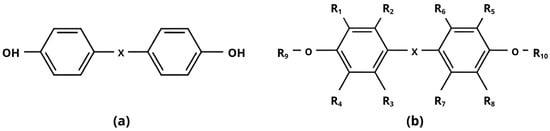 The chemical structure of substances for which the definitions of “bisphenol” and “bisphenol derivative” apply. (a) Bisphenol structure, (b) Bisphenol derivative structure. Notes: X refers to any bridging group separating the two phenyl rings by one single atom, but the atom can have any substituent(s). R1 to R10 refers to any substituent. At least one of the substituents is not a hydrogen atom (H).