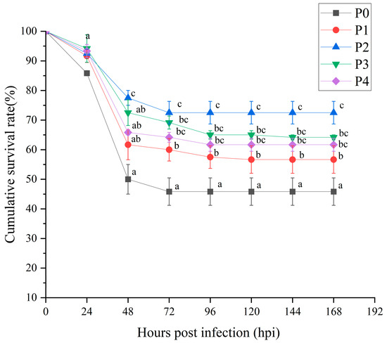 Survival of shrimp after Vibrio parahaemolyticus infection. Different groups are as follows: inject an equivalent volume of PBS (P0); inject phages at a concentration of 0.5 ppm (P1); inject phages at a concentration of 1 ppm (P2); inject phages at a concentration of 2 ppm (P3); inject phages at a concentration of 4 ppm (P4). Different letters above the error bars indicate significant differences among groups at each time point (p < 0.05, LSD post hoc test).