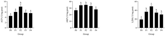 Effects of bacteriophages on AKP, ACP, and LZM activities in the hepatopancreas of shrimp infected by Vibrio parahaemolyticus. Data are expressed as mean ± standard error (SE) (n = 3). Groups are as follows: P0, inject an equivalent volume of PBS (control); P1, inject bacteriophages at 0.5 ppm; P2, at 1 ppm; P3, at 2 ppm; P4, at 4 ppm. Statistical significance was assessed by one-way ANOVA followed by Tukey’s multiple range test. Columns not sharing a common superscript letter (a, b, c) are significantly different at p < 0.05.