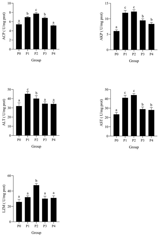 Effects of phages on AKP, ACP, AST, AST, and LZM activities in the serum of shrimp infected by Vibrio parahaemolyticus. Data are expressed as mean ± standard error (SE) (n = 3). Groups are as follows: P0, inject an equivalent volume of PBS (control); P1, inject bacteriophages at 0.5 ppm; P2, at 1 ppm; P3, at 2 ppm; P4, at 4 ppm. Statistical significance was assessed by one-way ANOVA followed by Tukey’s multiple range test. Columns not sharing a common superscript letter (a, b, c) are significantly different at p < 0.05.