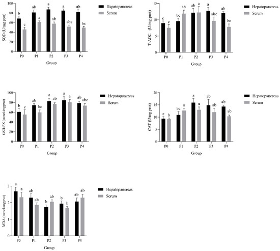 Effects of phages on SOD, T-AOC, GSH-PX, CAT, and MDA activities in the hepatopancreas and serum of shrimp infected by Vibrio parahaemolyticus. Data are expressed as mean ± standard error (SE) (n = 3). Groups are as follows: P0, inject an equivalent volume of PBS (control); P1, inject bacteriophages at 0.5 ppm; P2, at 1 ppm; P3, at 2 ppm; P4, at 4 ppm. Statistical significance was assessed by one-way ANOVA followed by Tukey’s multiple range test. Columns not sharing a common superscript letter (a, b, c) are significantly different at p < 0.05.
