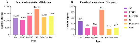 The number of reference genes (A) and new genes (B) annotated by GO, KEGG, COG, NR, Swiss-Prot, and Pfam.