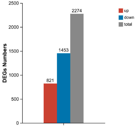 A total of 253,655,246 raw reads and 251,806,702 clean reads were obtained from six libraries. The Q20, Q30, and GC content of all samples were above 98.85%, 96.19%, and 45.13%, respectively, indicating high sequencing quality (Table 2). Comparing the above clean reads with the reference genome, the total mapped ratio of all samples ranged from 89.64% to 91.04%, which exceeded the standard of 70% (Table 3). These results showed that the sequencing data quality was reliable and suitable for subsequent analysis.