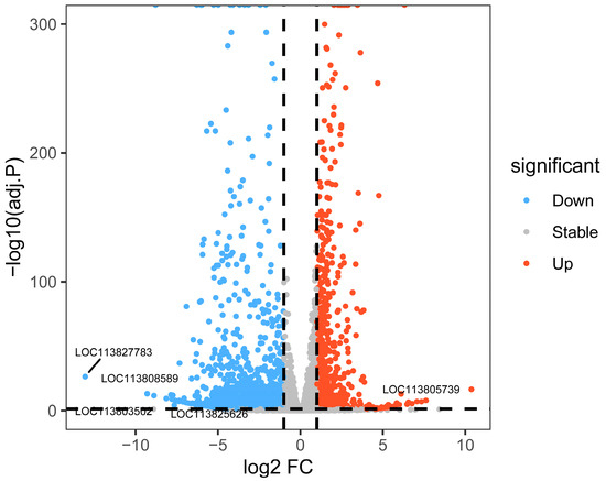 Comparative analysis between the P2 and P0 groups identified 2274 DEGs (Figure 7), including 821 upregulated and 1453 downregulated genes (|log2FC| ≥ 1, p < 0.05). A volcano plot displays several genes that stand out due to their strong responsiveness (Figure 8). Notably, genes like LOC113808589, LOC113805739, LOC113803502, and LOC113827783 may play important roles in immune regulation, metabolic adaptation, and resilience to oxidative stress considering phage therapy.