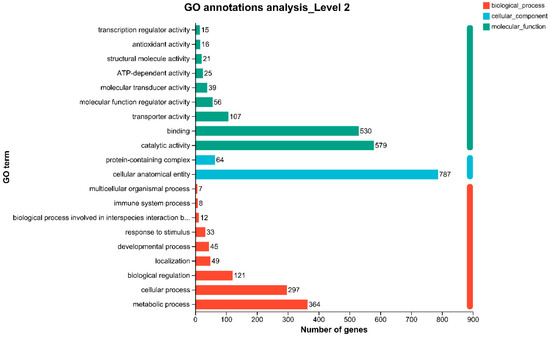 Gene Ontology (GO) annotation of these DEGs revealed classification into three primary categories: biological process (BP), cellular component (CC), and molecular function (MF) (Figure 9). In the BP category, the major associated terms included metabolic process, cellular process, and biological regulation. In the CC category, DEGs were mostly linked to cellular anatomical entity and protein-containing complex. In the MF category, DEGs were mainly involved in catalytic activity and binding, suggesting a prominent role in enzymatic function and molecular interaction during phage-induced regulation.