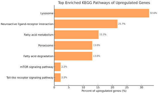 In contrast, the upregulated DEGs shown in Figure 11 were notably enriched in areas like lysosome activity, fatty acid metabolism and degradation, peroxisomes, the Toll-like receptor signaling pathway, and interactions between neuroactive ligands and receptors. These enriched pathways suggest that phage therapy may enhance immune surveillance, oxidative stress resistance, and metabolic flexibility in Litopenaeus vannamei during Vibrio parahaemolyticus infection.
