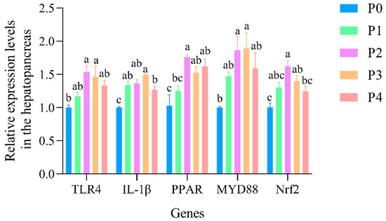 The relative expression levels of TLR4, IL-1β, PPAR, MYD88, and Nrf2 genes in the hepatopancreas of shrimp. Data are expressed as mean ± standard error (SE) (n = 3). Groups are as follows: P0, inject an equivalent volume of PBS (control); P1, inject bacteriophages at 0.5 ppm; P2, at 1 ppm; P3, at 2 ppm; P4, at 4 ppm. Statistical significance was assessed by one-way ANOVA followed by Tukey’s multiple range test. Columns not sharing a common superscript letter (a, b, c) are significantly different at p < 0.05.