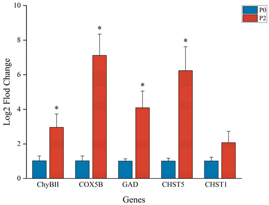 qPCR results. ∗ There was a significant difference in gene expression in the P2 group compared to the P0 group. Target gene abbreviations are as follows: Chymotrypsin BII-like, ChyBII; Cytochrome c oxidase subunit 5B, COX5B; MGlutamate decarboxylase, GAD; Carbohydrate sulfotransferase 5, CHST5; Carbohydrate sulfotransferase 1, CHST1.