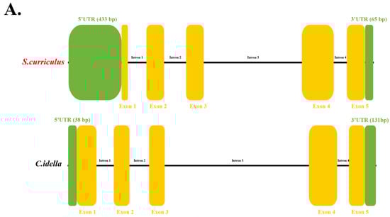 Gene structure analysis using barbel chub genomic annotation files and whole-genome sequencing data identified the ScDF gene as comprising four introns and five exons, along with a 433-bp 5′ untranslated region (UTR) and a 65-bp 3′ UTR (Figure 1A). To investigate structural differences between barbel chub and grass carp DF, a comparative analysis revealed that grass carp CiDF (GenBank: XM_051917986.1, chromosome 13) shares an identical exon-intron architecture (four introns and five exons) with ScDF but exhibits a shorter 5′ UTR (38 bp) and a longer 3′ UTR (131 bp) (Figure 1A). These findings suggest evolutionary conservation of DF gene organization between fish species, while highlighting the expanded 5′ UTR in ScDF as a potential regulatory divergence compared to CiDF (Figure 1A).
