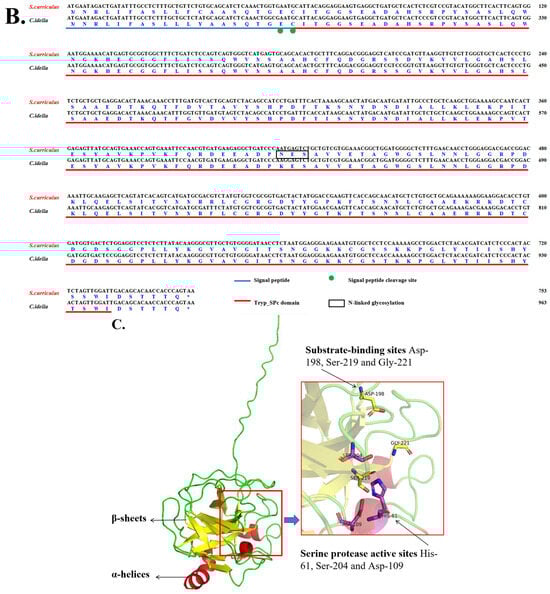 Structural features of ScDF. (A) Gene structure schematic of ScDF and CiDF. Yellow blocks represent exons, green blocks represent UTRs, and black lines between yellow blocks represent introns. (B) Amino acid sequence alignment of ScDF and CiDF revealing a unique N-glycosylation site at Asn139 in ScDF. (C) Tertiary structure of ScDF predicted using SWISS-MODEL (https://swissmodel.expasy.org/, accessed on 6 August 2024). Substrate-binding sites and serine protease active sites of ScDF are displayed and highlighted.