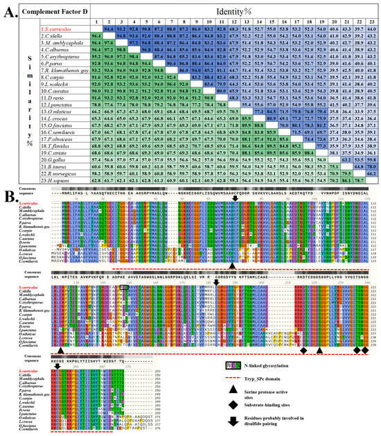 Domain prediction analysis demonstrated that ScDF mainly contains a Tryp_SPc domain and a signal peptide composed of 20 amino acids at its N-terminus, which means that ScDF is most likely an extracellular protein. To further explore the conservation of ScDF protein sequence features and functional sites, we further aligned the ScDF protein sequence with various vertebrate DF protein sequences. The statistical results of the similarity and identity of the comparison showed that ScDF shared higher similarity and identity with the DFs from other cyprinid fish (Figure 2A). Among them, ScDF and CiDF showed the highest similarity (96.4%) and identity (94.4%) (Figure 2A). At the same time, protein sequence analysis and alignment showed that ScDF protein was highly conserved with a typical Tryp_SPc domain (amino acid positions 20~244), three serine protease active sites, three substrate binding sites and three cysteine residues possibly involved in disulfide bond pairing, which were also conserved in DFs from other teleosts (Figure 2B).