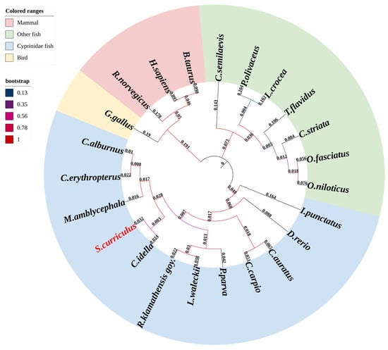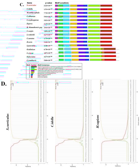 Phylogenetic reconstruction using DF amino acid sequences from 23 vertebrates demonstrated that ScDF clusters within the Cyprinidae clade alongside CiDF (Figure 3). The topology exhibited high bootstrap support (>90%) for monophyletic groupings corresponding to major vertebrate lineages (Figure 3); teleosts formed a distinct branch separated from tetrapods (mammals/birds), with divergence timelines aligning with key evolutionary events. The initial cladogenesis occurred approximately 400 million years ago (Mya), during the divergence between teleost and tetrapod ancestors, followed by a secondary radiation of 300 Mya when amniotes split into mammalian and sauropsid (including avian) lineages. All DFs represented orthologs derived from a common vertebrate ancestor, with intra-clade sequence conservation (e.g., cyprinids) contrasting sharply with reduced homology across divergent lineages (e.g., mammals vs. teleosts), correlating positively with phylogenetic distance (Figure 2A and Figure 3).