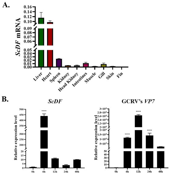 Hepatic dominance and early antiviral response of ScDF. (A) Tissue-specific distribution of constitutive ScDF mRNA in healthy barbel chub. Relative expression was quantified using the 2−ΔCt method to reflect absolute transcript abundance of ScDF in various tissues. (B) Time-course analysis of ScDF and viral VP7 expression in GCRV-infected SCK cells. The 2−ΔΔCt calculation method was employed to reveal fold-changes of ScDF and viral VP7 expression. Data represent mean ± SEM (n = 3; **** p < 0.0001; one-way ANOVA with Tukey’s test).