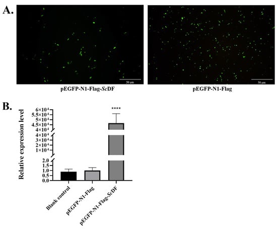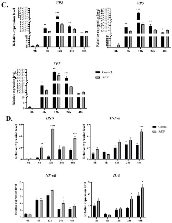 SCK cells (5 × 105 cells/well) were transfected with pEGFP-N1-Flag-ScDF or the empty vector (control) using PEI MAX (Polysciences, Niles, IL, USA). After 24 h, the cells were infected with GCRV (multiplicity of infection (MOI) = 1). Cells were harvested at 6, 12, 24, and 48 hpi for qPCR analysis of expression of viral genes (VP2, VP5, and VP7) and immune genes, including interferon regulatory factor 9 (IRF9), nuclear factor kappa B (NF-κB), tumor necrosis factor alpha (TNF-α), and interleukin 8 (IL-8).
