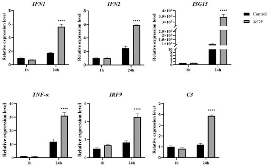 Immunomodulatory effects of recombinant ScDF. Recombinant ScDF induced immune gene expression in GCRV-infected SCK cells. Cells were pre-incubated with 20 μg/mL recombinant ScDF (or BSA control) for 6 h, followed by GCRV infection (MOI = 1) for 24 h. Expression levels of interferon pathway genes (IFN-1, IFN-2, and ISG15), complement component C3, and inflammatory mediators (TNF-α and IRF9) were quantified using qPCR at 1 hpi and 24 hpi. The 2−ΔΔCt calculation method was employed to reveal fold-changes of targeted gene expression. Data represent mean ± SEM (n = 3; **** p < 0.0001; two-way ANOVA with Tukey’s test).