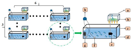 Schematic diagram of experimental unit. (a) Filter box; (b) biochemical filter cotton; (c) water tank; (d) crucian carp; (e) water pump; (f) air stone; (g) heating rod; (h) micro aeration device. The numbers 3 and 6 represent the number of repetitions and the number of groups, respectively. The black dot indicates the omission of the graphic, and the green dashed line indicates a detailed explanation for one of the breeding equipment.
