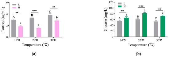 Effects of thermal and hypoxic stress on cortisol and blood glucose levels in crucian carp. Different uppercase and lowercase letters indicate significant differences between the treatments (p < 0.05). ** represents p < 0.01, and *** represents p < 0.001. L denotes hypoxic treatment, H denotes hyperoxic treatment. (a) Cortisol; (b) glucose.